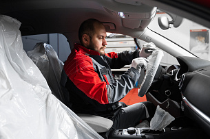 Накрываем салон автомобиля специальными одноразовыми чехлами. По необходимости кузов накрываем плотным материалом, чтобы избежать царапин.